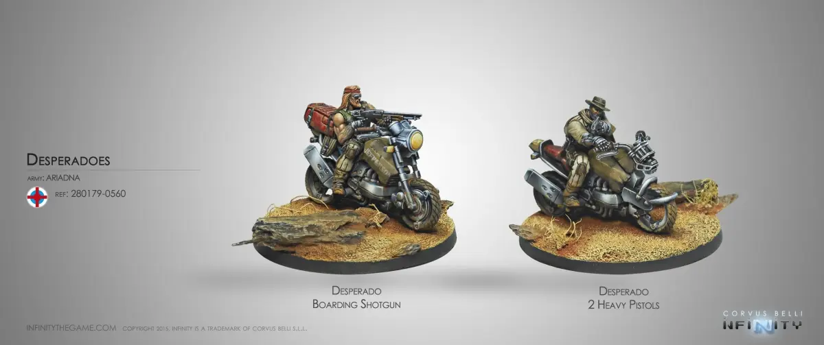 A model and troop profile for the USAriadna Ranger Force. Riding their roaring motorbikes, the Desperadoes are the ideal choice to launch against the enemy at full speed and spread chaos amongst the enemy lines. They will never know what hit them!