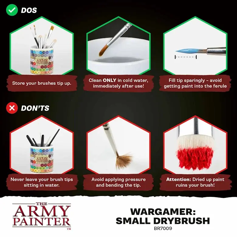 Penselns storlek är särskilt anpassad för att drybrusha specifika delar av en modell, exempelvis ringbrynjor, vapen eller andra detaljer – snarare än hela modellen på en gång.