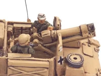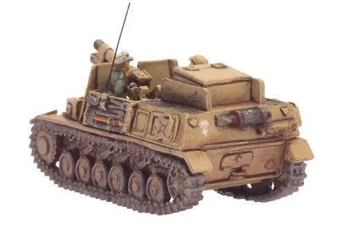 Their direct fire anti-tank is somewhat reduced due to the lack of HEAT rounds in the desert (AT 8/4). Their armour is reasonable, though not enough to be taking too many risks with (F2, S1, F0).