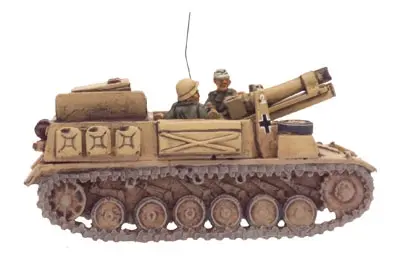 The Bison has a 15cm sIG33 (L/12) infantry gun mounted on a highly modified Panzer II chassis. The Panzer II chassis was both widened, lengthened and an extra roadwheel added. The destructive power of the 15cm round of the sIG 33 was greatly appreciated, but due to the short range and poor mobility of the towed gun, it rarely got into action during attacks.