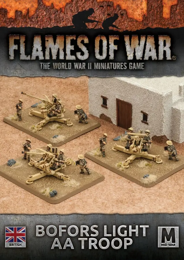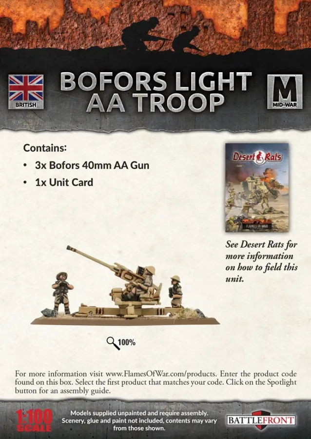 Includes three metal Bofors anti-aircraft guns, three large six-hole bases, one base plug sprue and one Unit card.