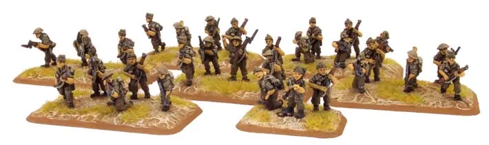 Peter Young's No.3 Commando was the first into battle and determined to be the best. It fought in Europe, Sicily and Italy. Contains: 1 Young, 2 officers, 6 SMG gunners, 5 Bren gunners, 1 PIAT gunner, 24 riflemen, 4 small and 6 medium bases.