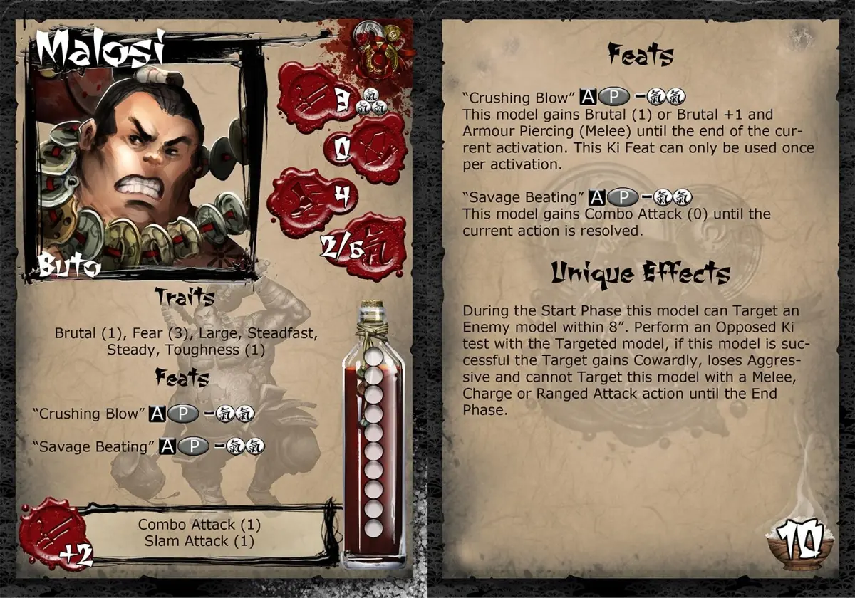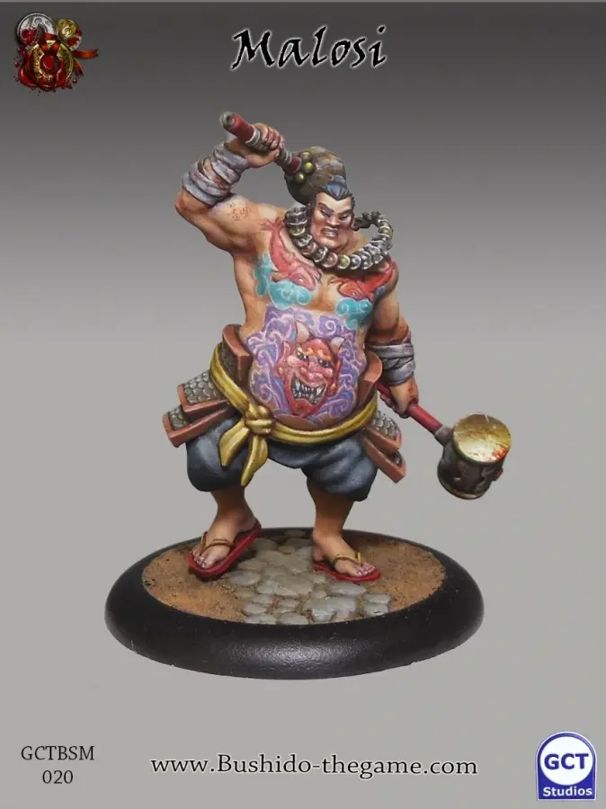 In the Jumo ring there can only be one winner, Malosi is that winner. The champion of the Iron Fist gumi, Oda’s best student. A Buto as strong and fearsome as any other in memory, to look into his blank stare is enough to break the spirit of even the stoutest. Few words are muttered from this hulking monster, in combat he sounds more animal than human, growling and grunting whilst handing out savaging beatings with fist or skull crushing mace, smashing the armoured like beetles beneath an angry bull’s hoof.