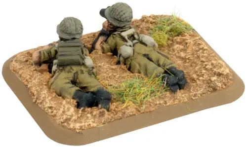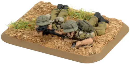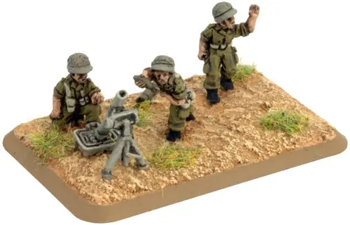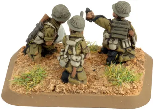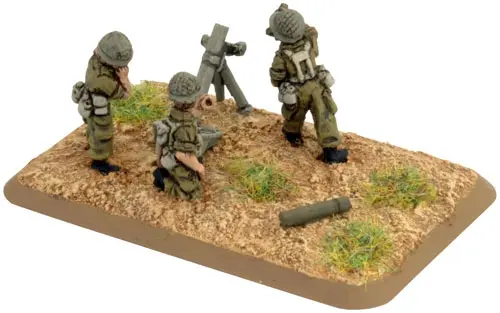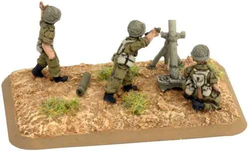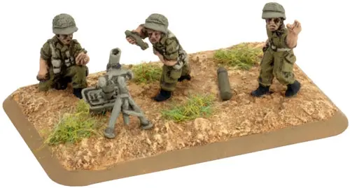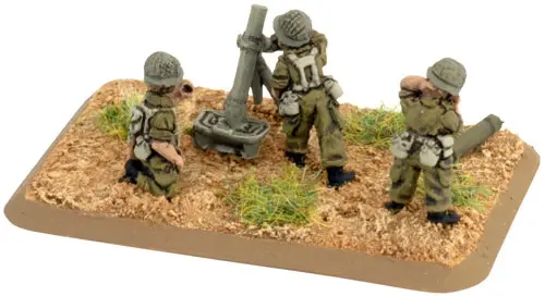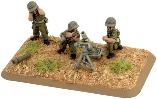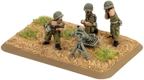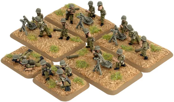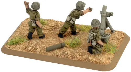 includes one Command Rifle team, one Observer Rifle team, four M1 81mm mortar teams with crew, one Small three-hole base, one Small two-hole base, four Medium four-hole bases, & two Base plug sprues.
