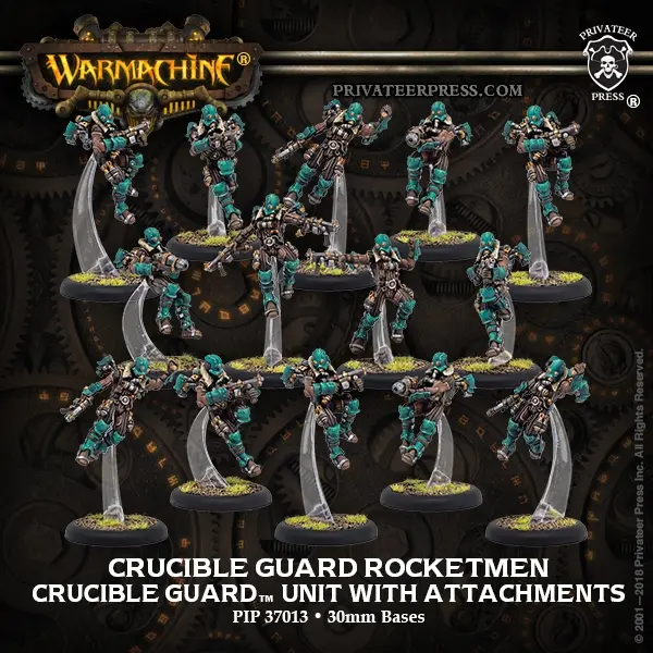 Squads of Crucible Guard rocketmen streak across the skies, giving the Crucible Guard an edge against a more numerous foe. Rocketmen assault the flanks of an opposing force, picking off strategic targets with their carbines or dropping devastating gravity bombs into packed enemy formations. Able to fly over traditional defenses, rocketmen squads are tactically versatile soldiers unlike anything before seen in the modern militaries of the Iron Kingdoms.