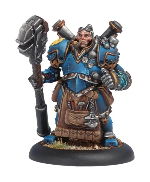 An arcane mechanik of surpassing skill, Arian Strangewayes has an unshakable confidence in the Cygaran warjacks he commands in battle. He takes each rent in armor, each broken steam pipe, and each severed piston as a personal insult and repairs them in the field with nearly casual ease. Strangewayes' complex steam armor and the spray of cracking voltaic energy from his gauntlet are more than enough to see him through the toughest fight.