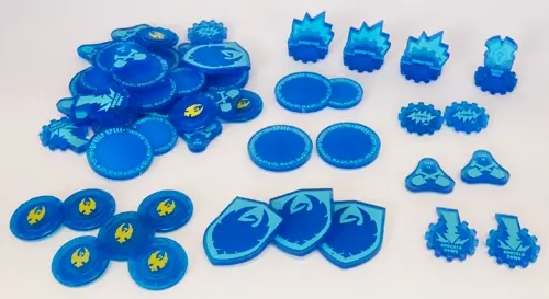 This official WARMACHINE token set includes 10 focus tokens, 5 spell tokens, 5 upkeep spell tokens, 5 customizable faction tokens, 3 power tokens, 3 Disruption tokens, 10 dug in tokens, 4 knocked down tokens, 1 shield wall token, and 4 token stands.