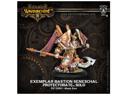 The Exemplar Bastion Seneschal solo comes in a blister (PIP 32090). A player may field up to two Exemplar Bastion Seneschals for each warcaster in a Protectorate army.