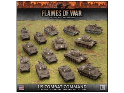 includes eight plastic M4 Sherman tanks, three plastic M26 Pershing tanks, three plastic M7 Priest Self-Propelled Guns, two plastic Tank Commander sprues, one plastic Gun Crew sprue, one Flames Of War Mini rulebook, one printed Start Here guide, three Decal sheets and nine Unit cards.