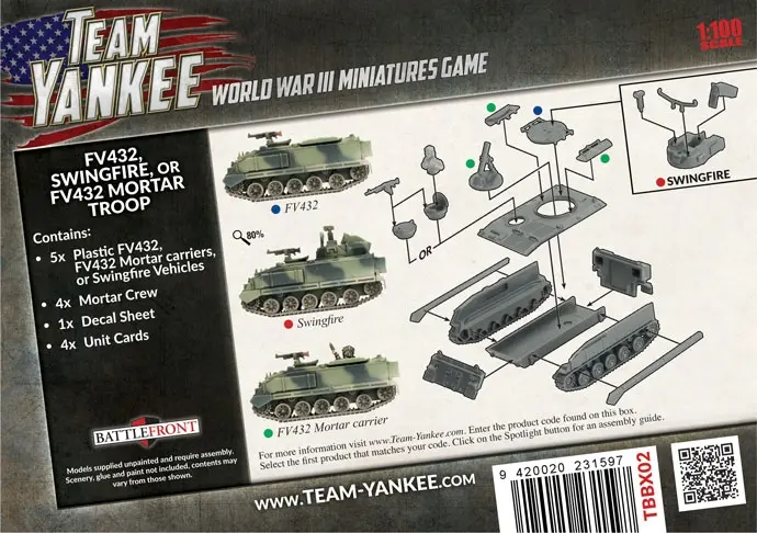 Includes five plastic FV432 Armoured Personnel Carriers, which can also be assembled as mortar carriers or Swingfire guided missile vehicles, six resin vehicle commander figures, eight resin mortar crew, decal sheet & four unit cards.