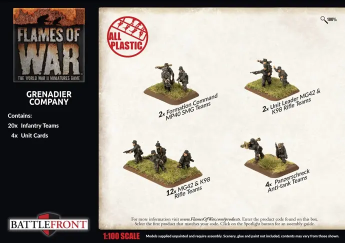 Includes two Formation Command MP40 SMG Teams, two Unit Leader MG42 & K98 Rifle Teams,twelve MG42 & K98 Rifle Teams, four Panzerschreck Anti-tank Teams, and four Unit cards.