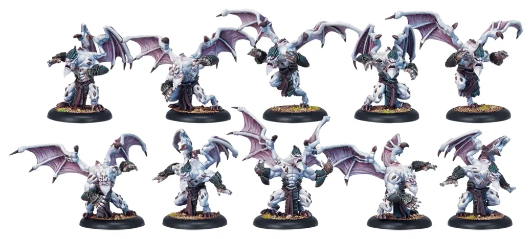 Wretched and degenerate, blighted Nyss grotesques are winged horrors so twisted by Everblight’s power they hardly resemble the coldly beautiful Nyss from which they are descended. Driven by only the basest instincts of hunger and a desire to spill blood, these fearless marauders strike swiftly from the sky, converging on their prey in a cloud of leathery wings and slashing talons. The skies darken with nightmare shapes as the Legion of Everblight spreads terror and pain across western Immoren.