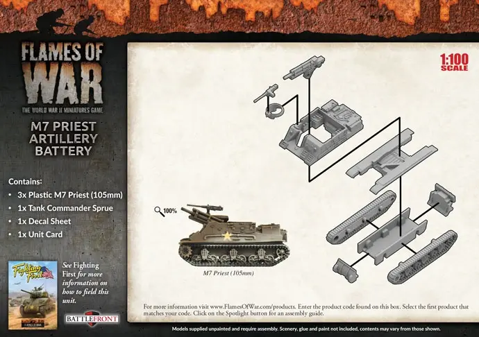 Includes three plastic M7 Priests, one plastic Commander sprue, one Decal Sheet and one Unit cards.