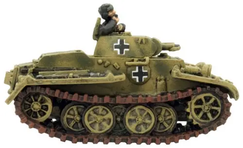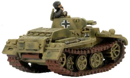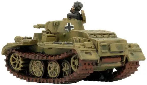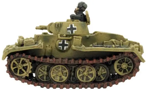 The Panzer I F is a well-designed infantry support vehicle. Its armour protects it from any anti-tank weapon it is likely to face. The 20”/50cm wide tracks enable it to cross any terrain in its path, while a complex but efficient interleaved suspension distributes its weight evenly.