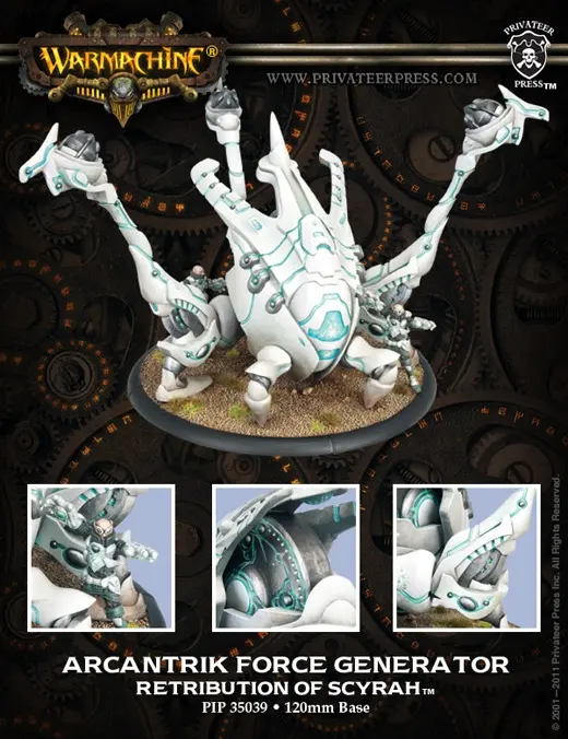 The arcantrik force generator is a massive engine of war that houses one of the most devastating and complex weapons in the arsenal of the Retribution of Scyrah. Its teleforce cannon, which fires concentrated bursts of kinetic energy, represents the very pinnacle of Iosan arcane science. Blasts from the force generator shatter anything they touch, reduce the ground to craters and rubble, and fling enemies aside like broken dolls.