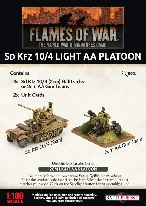 Includes four Sd Kfz 10/4 2cm Light AA tanks or 2cm AA Gun Teams, one metal driver head sprue and two Unit cards.
