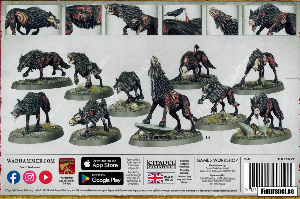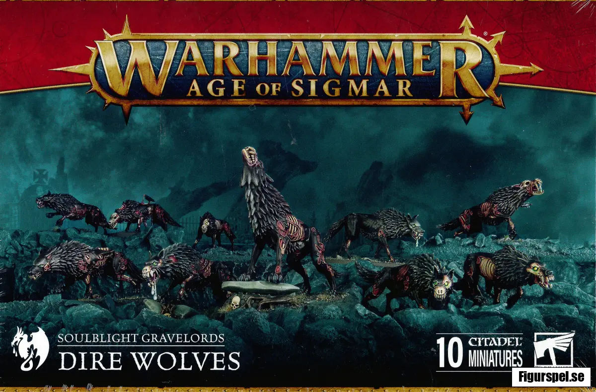 Dire Wolves är snabba och brutala, perfekta för att jaga ned fiender, hota flanker och slå till mot isolerade enheter. Modellerna är fulla av karaktärsfulla detaljer som exponerade ben och ruttnande kött.