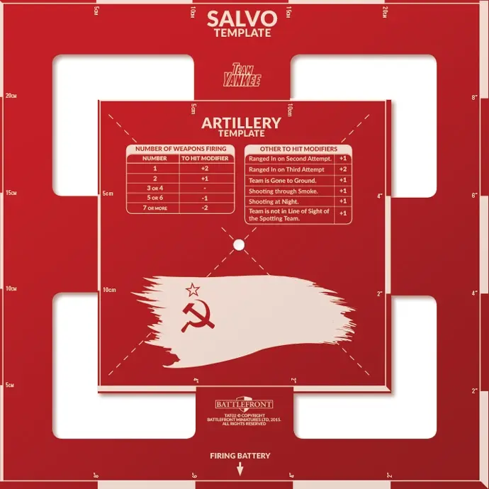 There are two sizes of template available in the game: Artillery (6”/15cm square) and Salvo (10”/25cm square) depending on the ROF rating of the weapons firing. This transparent laser-cut acrylic template integrates both sizes in one handy piece.