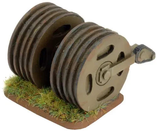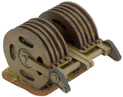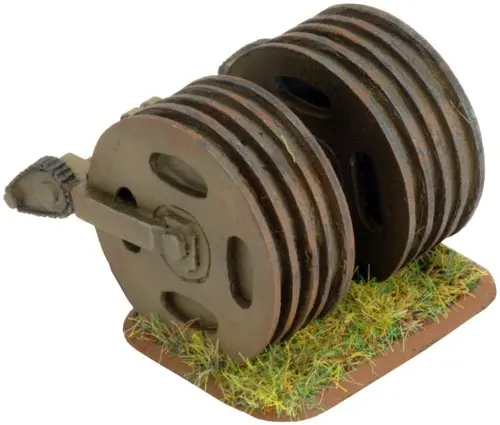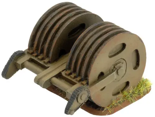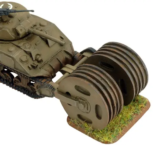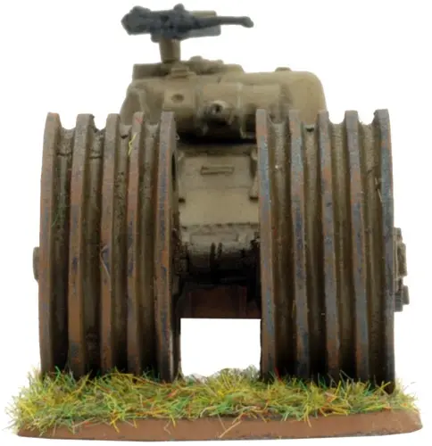 The T1E3 Aunt Jemima utilised the pressure type system in the form of two rollers each made up of five large metal discs. Propelled along by a Sherman tank, the system was nicknamed after a famous pre-made pancake mix (Aunt Jemima’s) as the discs were said to resemble large pancakes. The size of each disc; 10cm wide and 2.46m in height meant their massive weight (26,000kg total) provided the necessary ground pressure to detonate any mines it encountered.