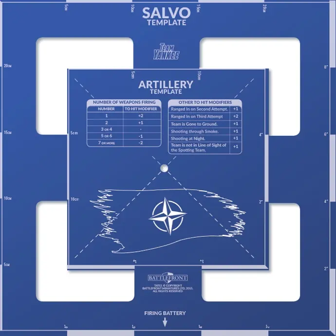 There are two sizes of template available in the game: Artillery (6”/15cm square) and Salvo (10”/25cm square) depending on the ROF rating of the weapons firing. This transparent laser-cut acrylic template integrates both sizes in one handy piece.