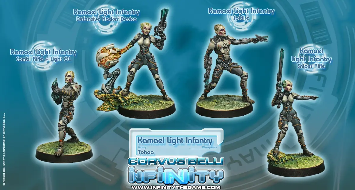 Another Infinity unit box! Booster Packs have been designed to provide the support weapon options for core troops for the cheapest price. And here you have the first of them dedicated to the Tohaa base infantry unit. In this box you will find four multi-part models, two males and two females, with the Spitfire, Sniper, Hacker and the Combi Rifle + Light Grenade Launcher weapon options. The Kamael Infantry are the backbone of the Tohaa Trident and the core of any combat action conducted by this alien race, both massed battles and limited operations.