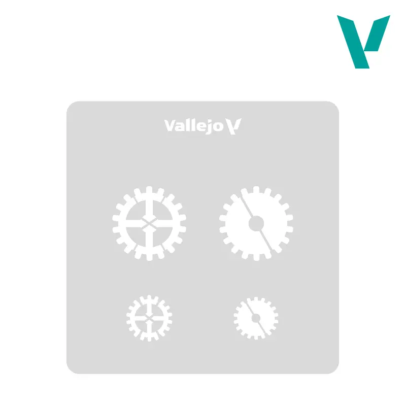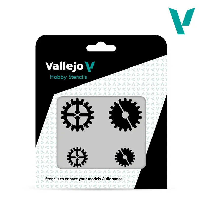 Stencil med kugghjulsmarkeringar för detaljer på industriella fantasy-dioramor, robotar, fordon och terräng.