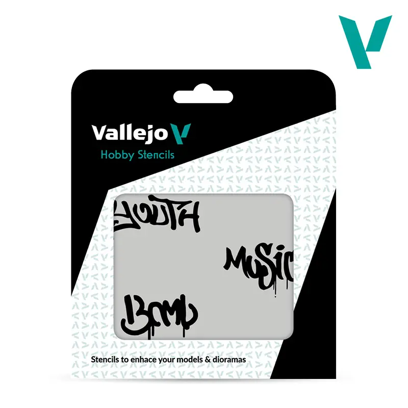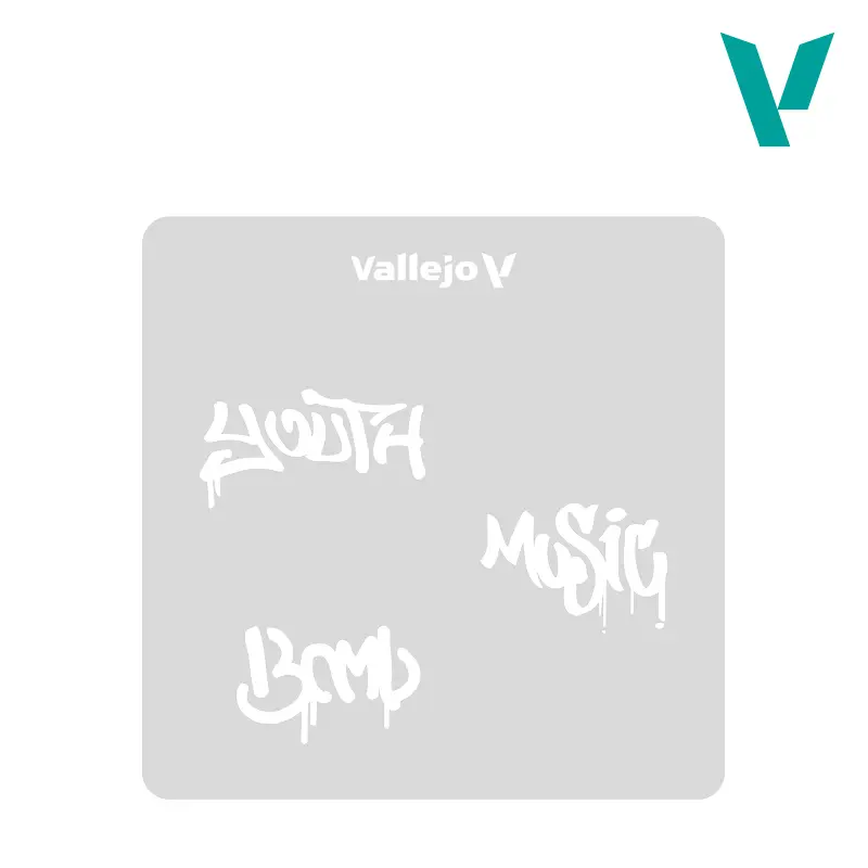 Stencil med street art-graffiti i fri stil. Kan även användas för skuggeffekter och nedtonade spraymålade detaljer i dioramor och modellbyggen.