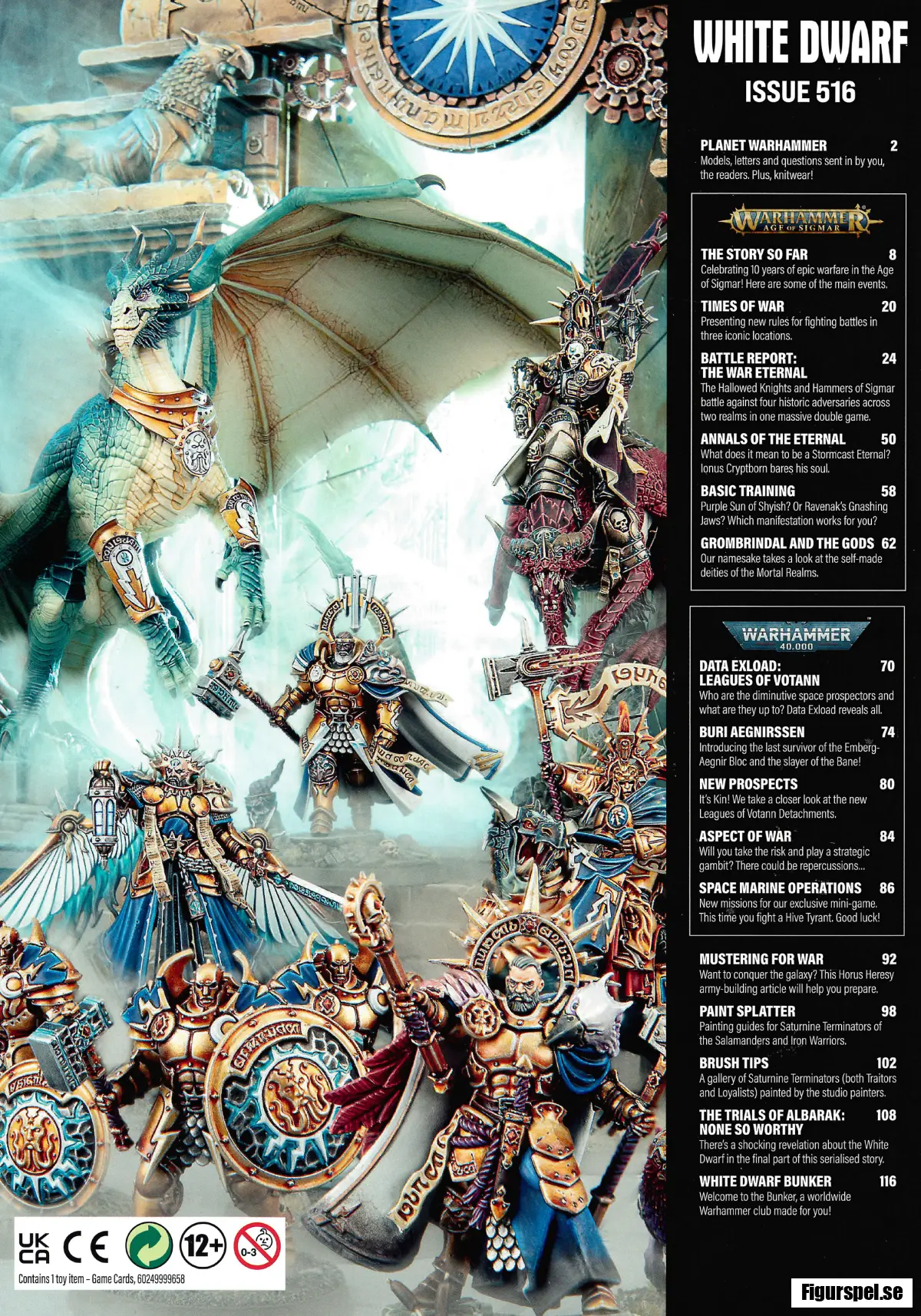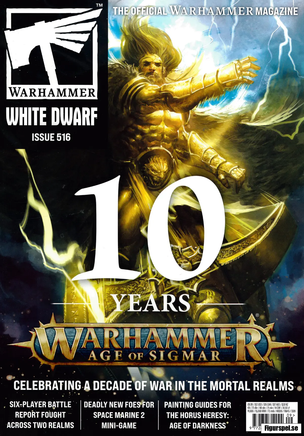 Age of Sigmar – Fira 10 år av krig med en massiv Battle Report: The War Eternal där Hallowed Knights och Hammers of Sigmar drabbar samman med fyra klassiska fiender över två realms. Dessutom nya regler för strider på ikoniska platser och en inblick i Stormcast Eternals.